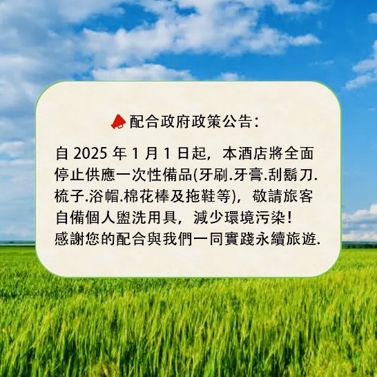 自2025/1/1日起,本酒店全面停止供應一次性備品(牙刷.牙膏.刮鬍刀.梳子.浴帽.棉花棒.拖鞋等)